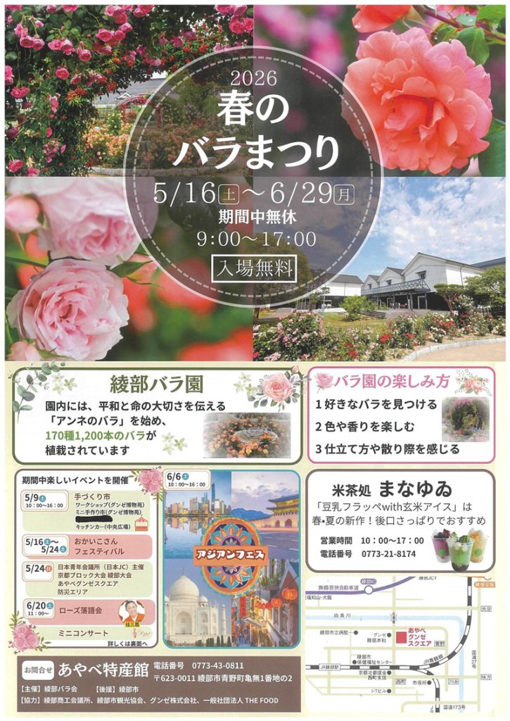 会場となる綾部バラ園には、「アンネのバラ」をはじめ、約170種・1,200本もの多彩なバラが咲き誇り、園内は華やかな香りと彩りに包まれます。期間中は休園日なし、入場無料で気軽に楽しめるのも魅力です。