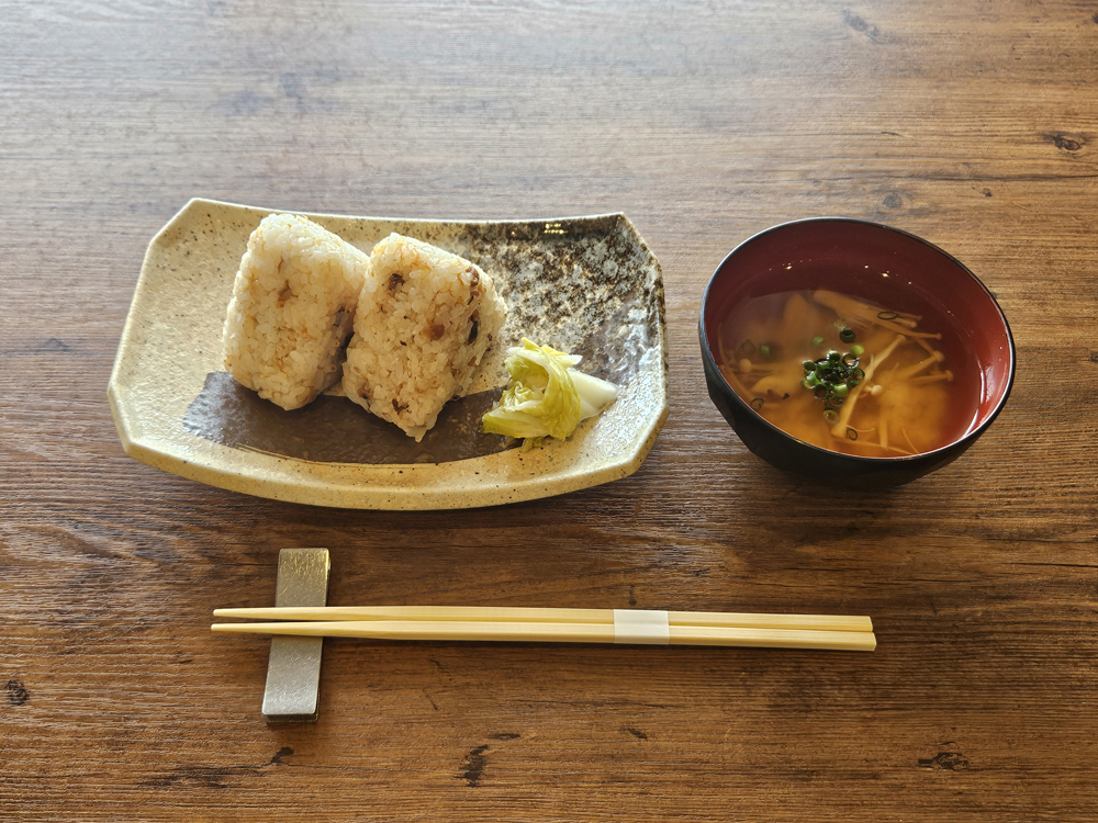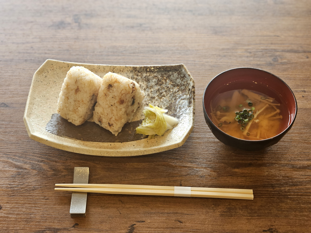 素泊まりに夜食のへしこおにぎりと日替わりの味噌汁が付いたプランです。