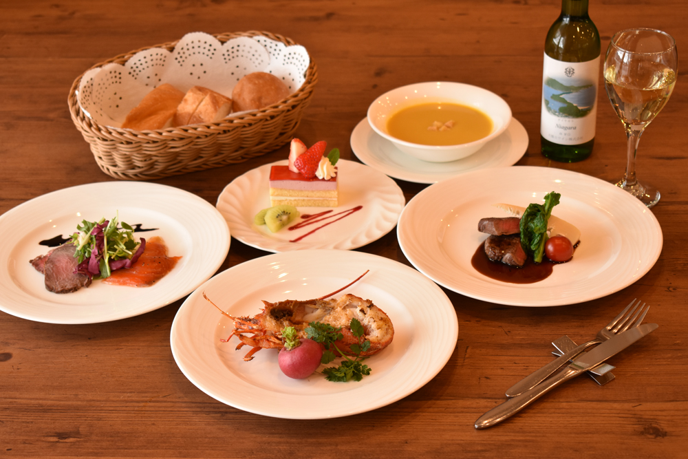 当館レストランの夕食は地元の食材とハーブをふんだんに使用した創作フランス料理コース料理