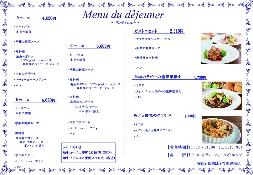 ランチでは創作フランス料理のコース料理を4,620円のコースからメイン日替わりのビストロセット