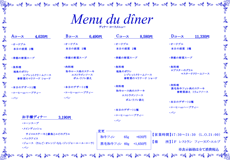 ディナーはメインお魚料理のコース4,620円(税サ込)からメインお肉料理のコース6,490円(税サ込)