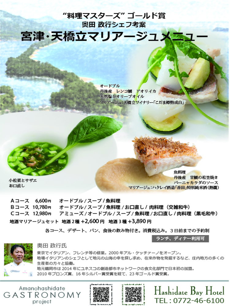 日本を代表するプロ料理人がタッグを組み、一緒に協議し、宮津 天橋立の食材を活用し地酒と最高のペアリングで味わえるメニューを開発しました。当館では『料理マスターズ』ゴールド賞の奥田シェフが考案したメニュー3品を取り入れ、地元の方はもちろん来丹されるお客様に、丹後は素材の宝庫であり、それを新鮮な状態で提供できる場所である事を感じて頂きたい思います。